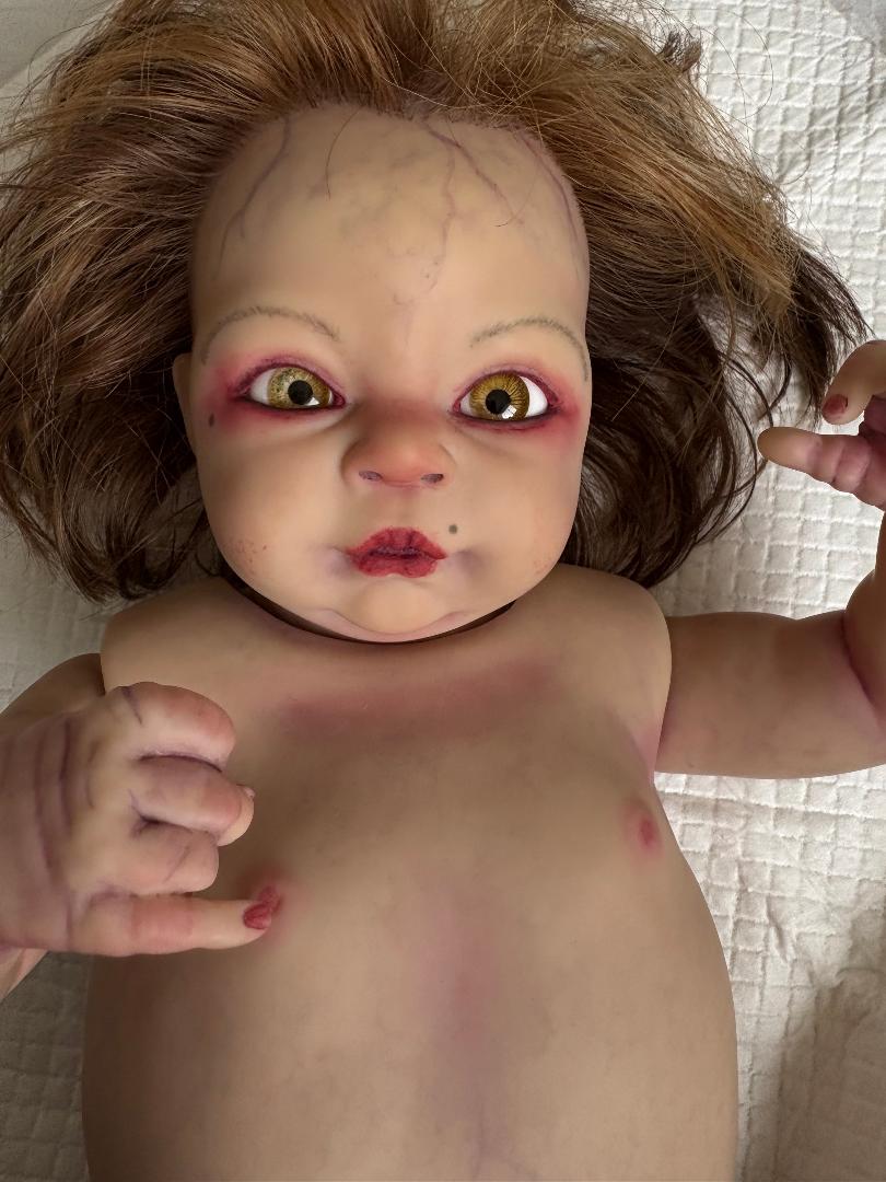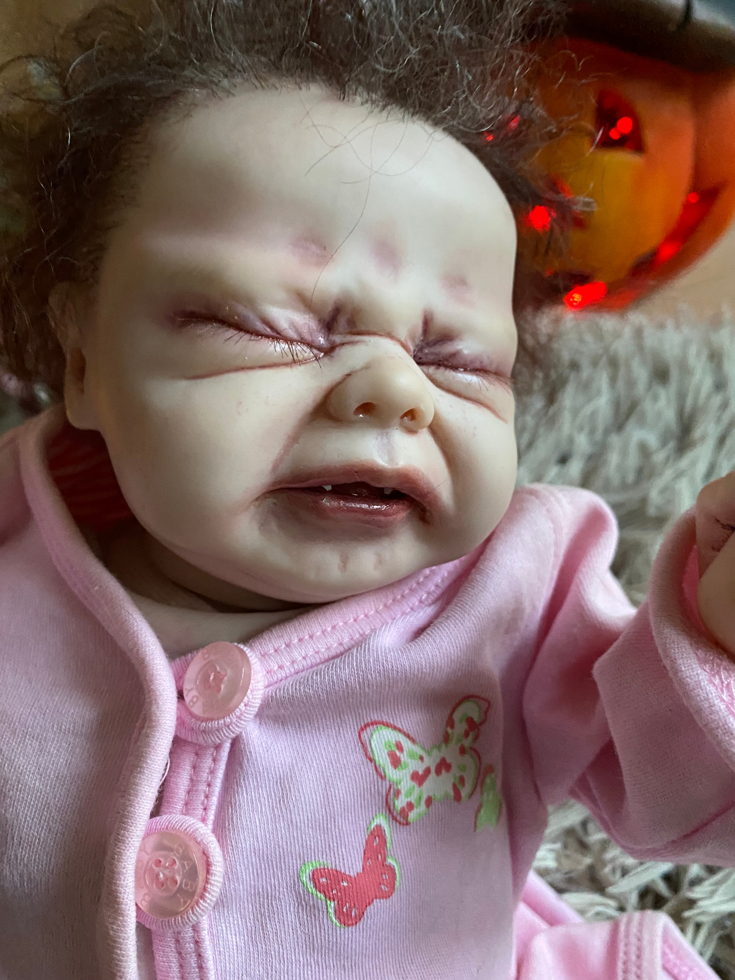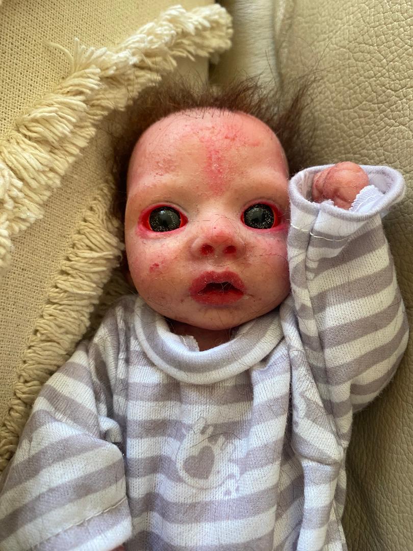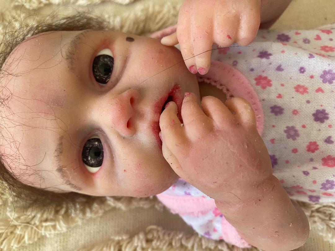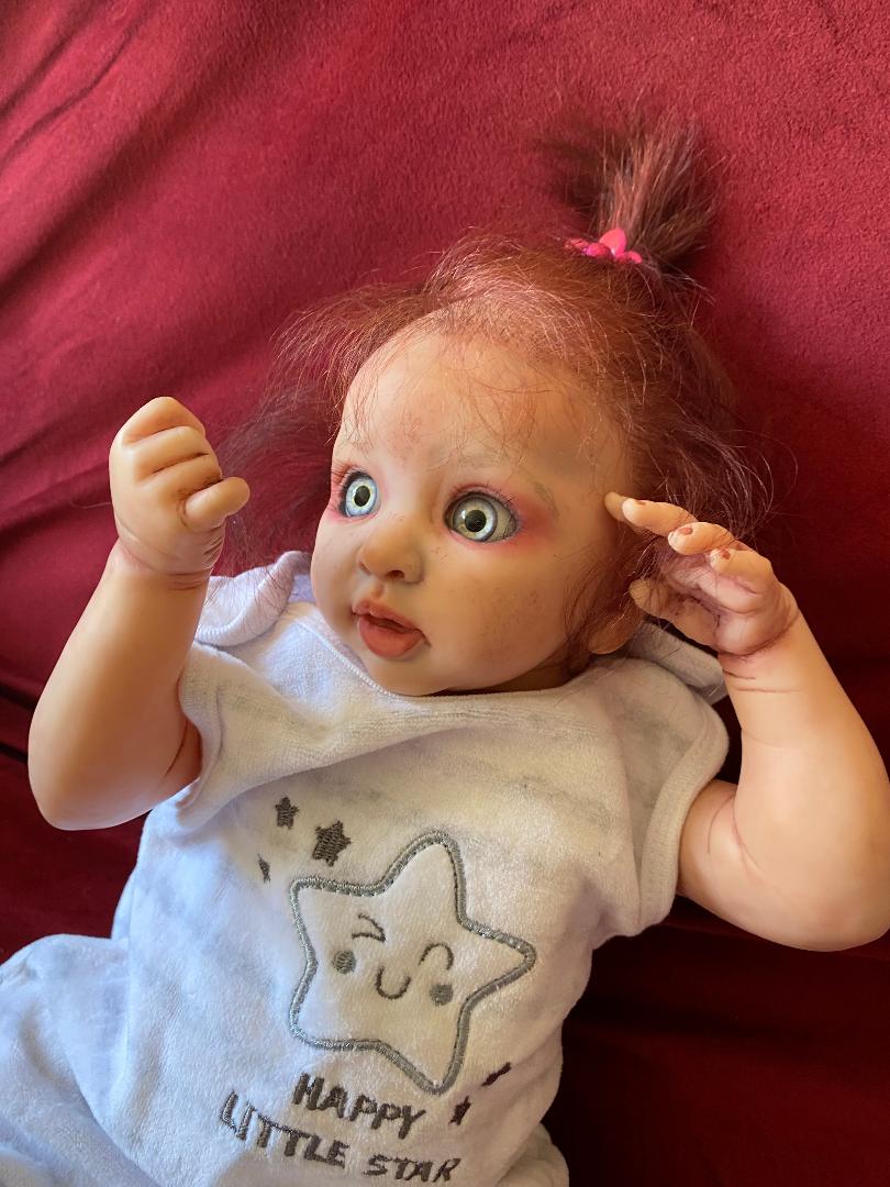 Painted with GHP filled with wit hypoallergic polyfill, weighted wit glass beads.Her hair is a hand rooted reborn mohair.